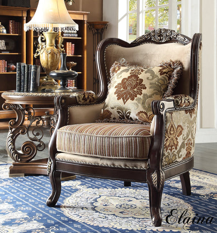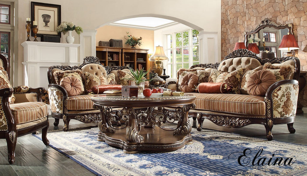 The elaborate designs of Old World Europe are treated with a distinct modern touch in Elaina sofa set. The eye-catching design reflects with a brilliance intended to accentuate the dusky taupe coloring of the fabrics, with the gold-tone finish of the show wood frame. With details such as shell and acanthus leaf scrolling, routed Solid Wood and frame legs, the traditional look of the sofa is solidified. The accenting faux silk toss pillows feature traditional fringe detailing and complementing detail patterns. Includes all the throw pillows.