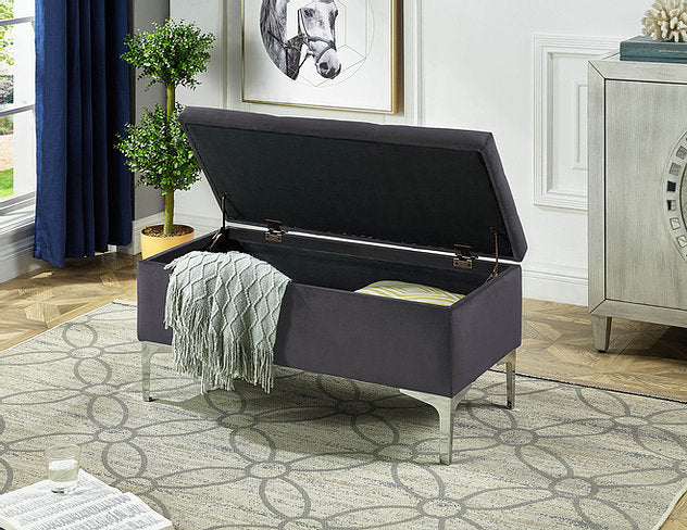 Grey Velvet Storage Bench with Deep Tufting and Chrome Legs