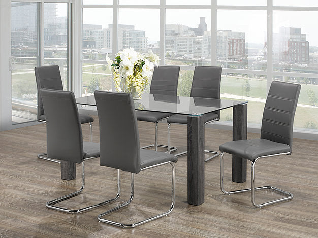Table: 10mm Tempered Clear Glass with Grey Wooden Legs and Chrome Accents