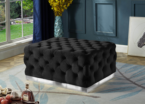 Black Velvet Ottoman with Deep Tufting and Stainless Steel Base