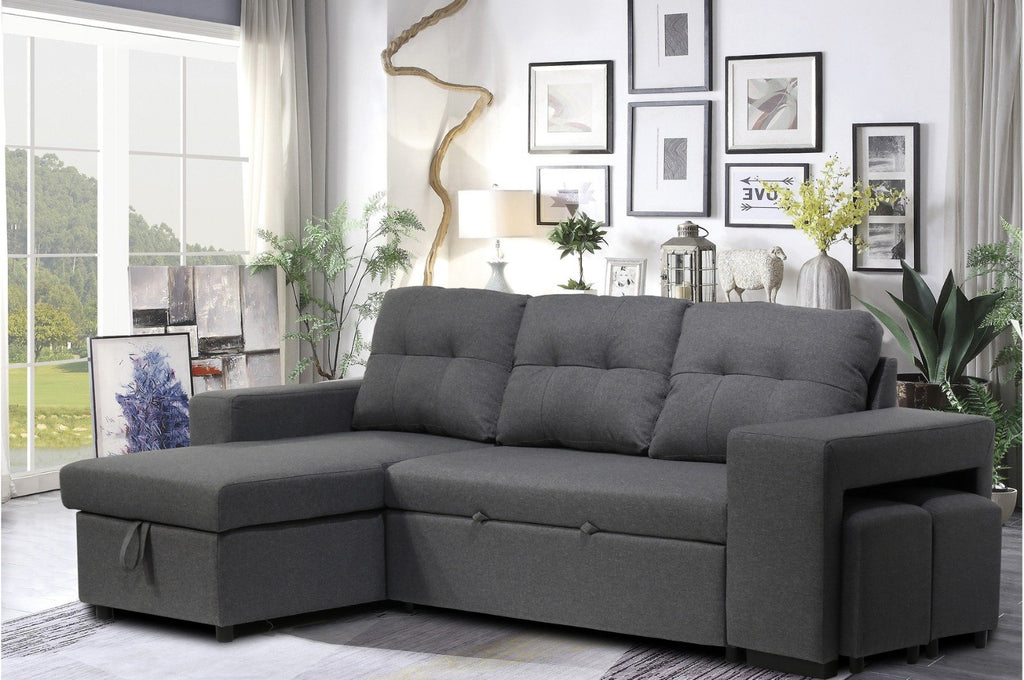 Victor Reversible Sectional Pull-Out Sofa Bed with Storage Chaise, 2 Ottomans and In-Built Book-Shelf